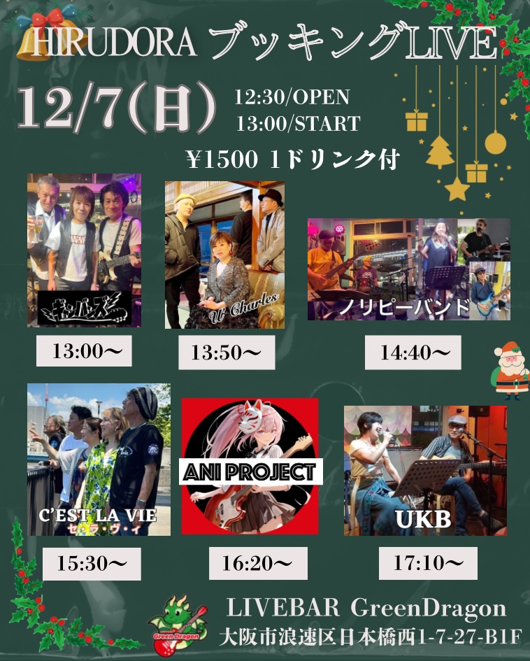 【HIRUDORA ブッキングLIVE】 2025.12.7(日)12:30OPEN 13:00START 1500円1ドリンク付HIRUDORA ブッキングLIVE開催します♬出演者様・ギャンバンズ・U Carles・ノリピー…