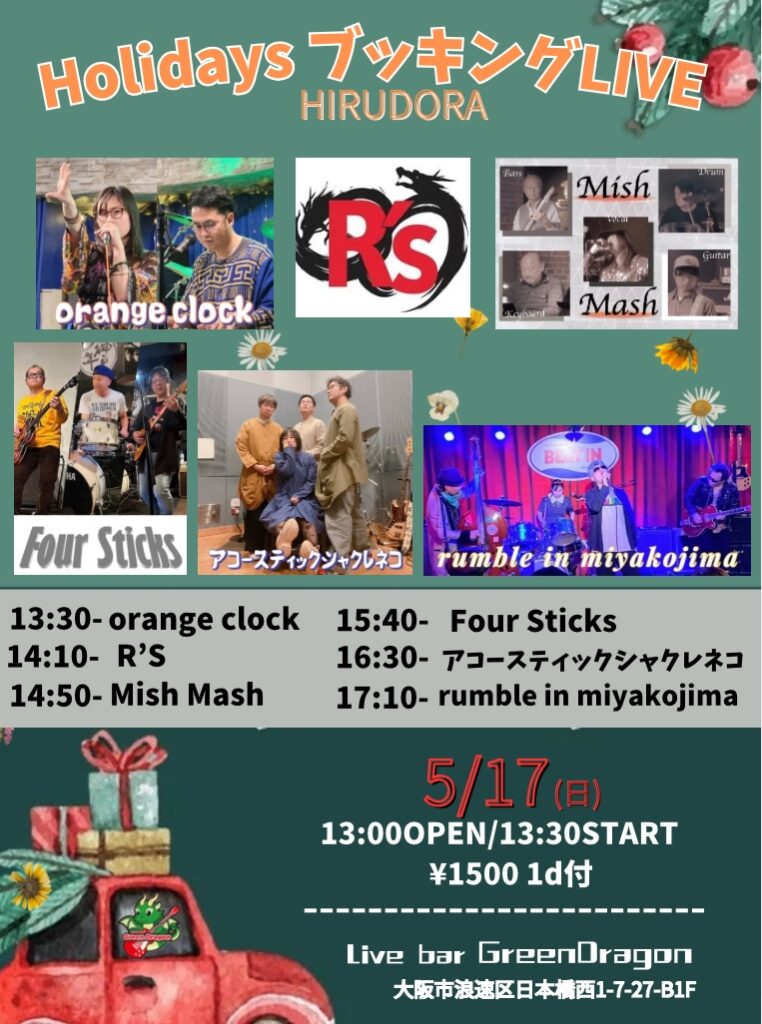 【HIRUDORA Holidays ブッキングLIVE】 2026.5.17(日)13:00OPEN 13:30START 1500円1ドリンク付HIRUDORA HolidaysブッキングLIVE開催します♬出演者様・orange clock・R’…