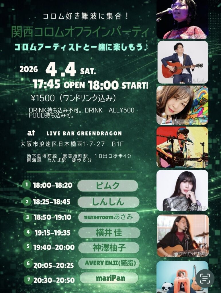 【関西コロムオフラインパーティー】 2026.4.4(土)17:45OPEN 18:00START 1500円1ドリンク付関西コロムオフラインパーティーが開催されます♬コロムアーティストと一緒に… -
