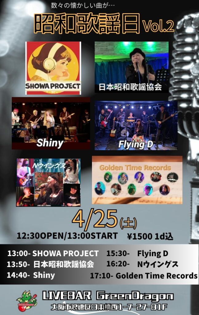 【昭和歌謡日vol.2】 2026.4.25(土)12:30OPEN 13:00START 1500円1ドリンク付昭和歌謡日vol.2開催します♬出演者様・SHOWA PROJECT・日本昭和歌謡協会・Shiny・Flying D… -