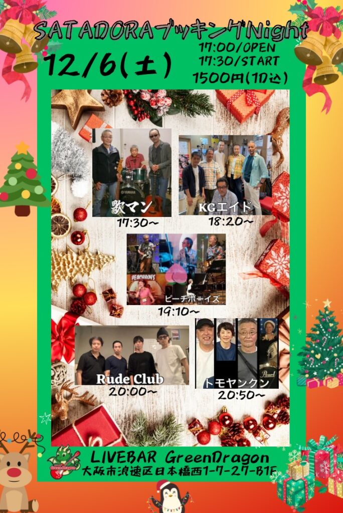SATADORAブッキングNight【SATADORAブッキングNight】 2025.12.6(土)17:00OPEN 17:30START 1500円1ドリンク付SATADORAブッキングNightLIVE開催致します♬出演者様・歌マン・KGエイド・PEACHBOYS…