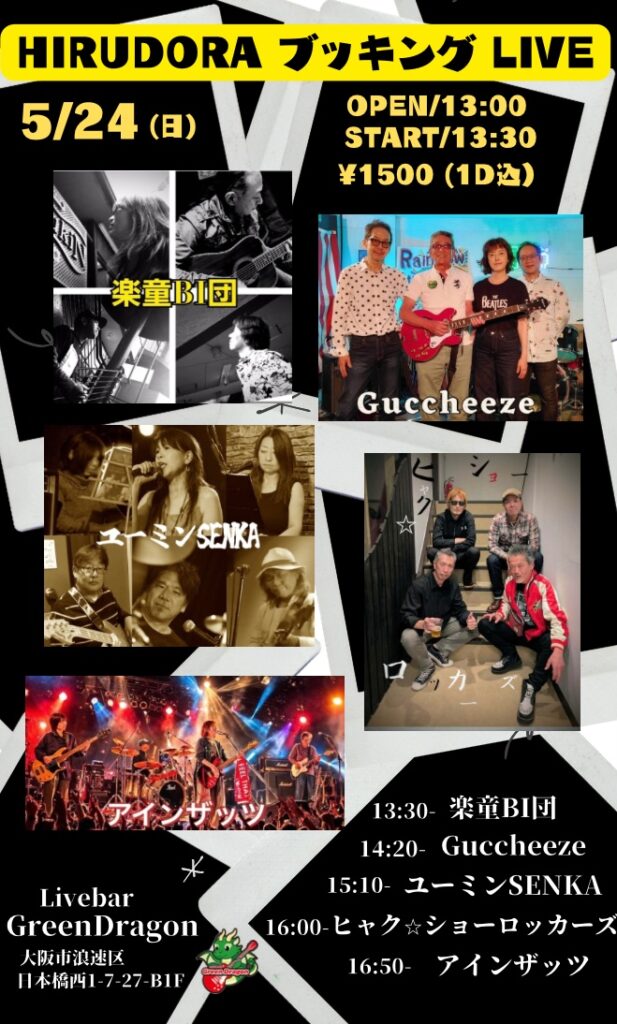 【HIRUDORAブッキングLIVE】 2026.5.24(日)13:00OPEN 13:30START 1500円1ドリンク付HIRUDORAブッキングLIVE開催します♬出演者様・楽童BI団・Guccheeze・ユーミンSENKA…