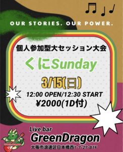 くにSUNDAY 2026 3/13 イベント詳細 日付: 2026年3月15日 12:00 PM – 6:00 PM 2026.3.15(日)12:00OPEN 12:30START 2000円ドリンク付 くにSUNDAY開催致します♬ 個人参加型大セッション大会です よろしくお願い致します 【貸切】バンド練習 ゆるゆるソウル・ファンクセッション